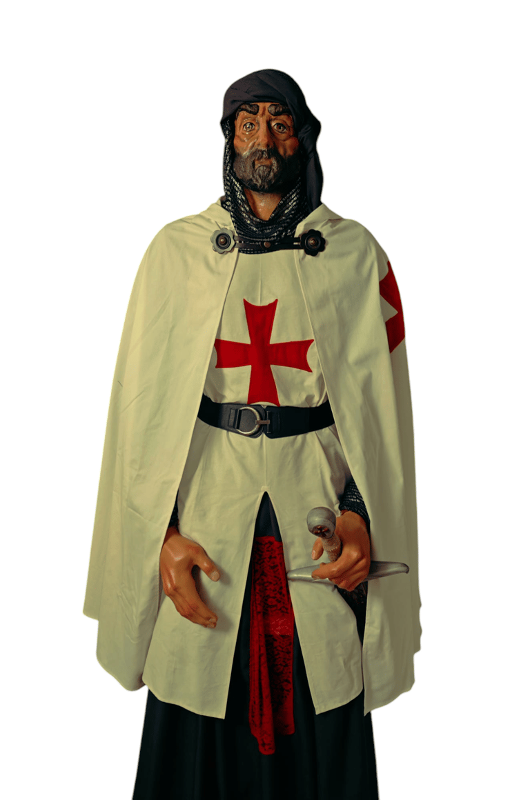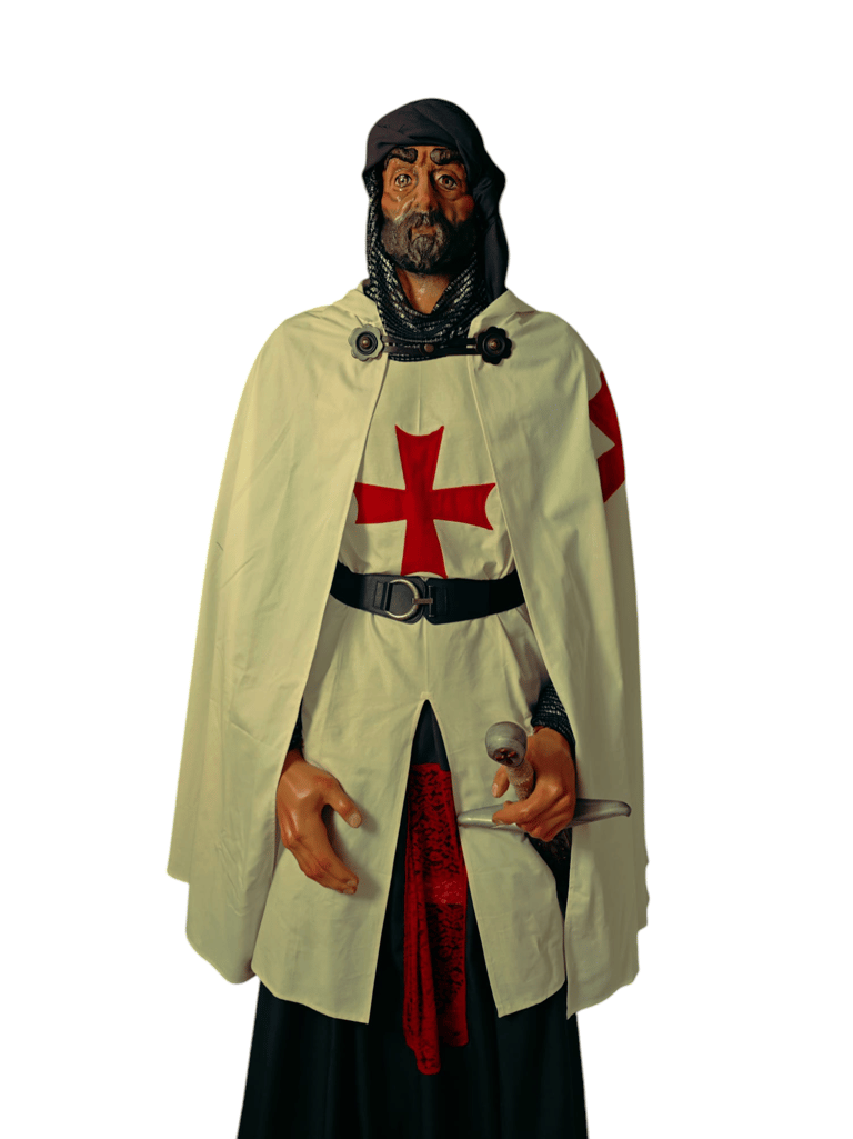 Realización de un gigante particular que representa a los antiguos templarios, para dicho gigante han sido realizadas en cartón fallero la cabeza, manos y cuerpo, donde se han estucado con técnicas y materiales tradicionales y finalmente policromadas.
